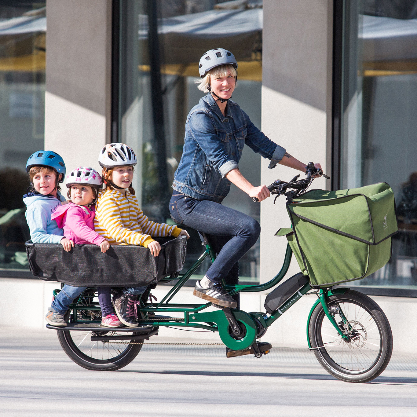Designed to mount up to two child seats or the optional Kiddie pack or a combination of both. The Justlong comes with a huge front-mounted PVC bag to store everything, or you can upgrade to the more premium Cordura finish for a small cost. It perfectly suits family transport, commercial or industrial use.