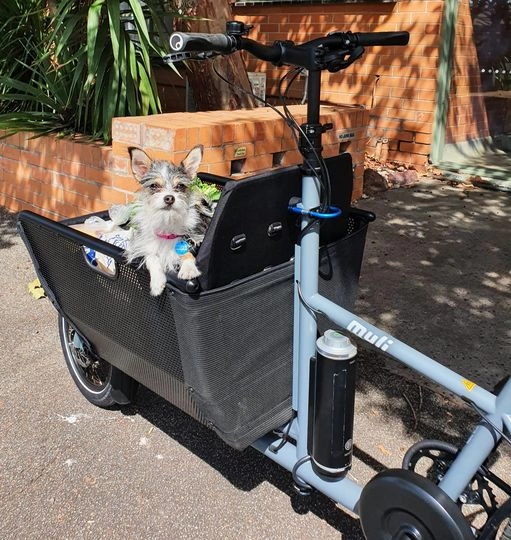 Some dogs take to riding straight away, but others need a little encouragement. Training a dog to ride in a cargo bike involves gradually introducing them to the bike and ensuring their comfort and safety. Start by allowing the dog to explore the stationary bike and basket or carrier while at home – of course, using treats and praise to create positive associations. Then, begin with very short rides, gradually increasing the distance and time as the dog becomes more comfortable with the experience.