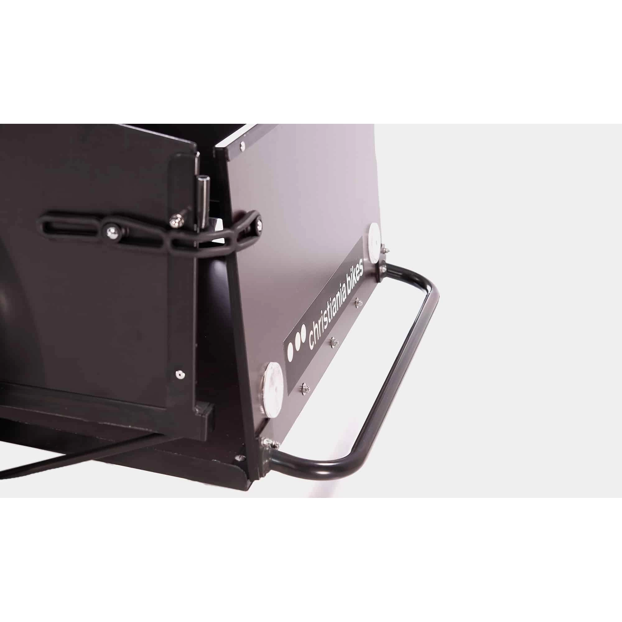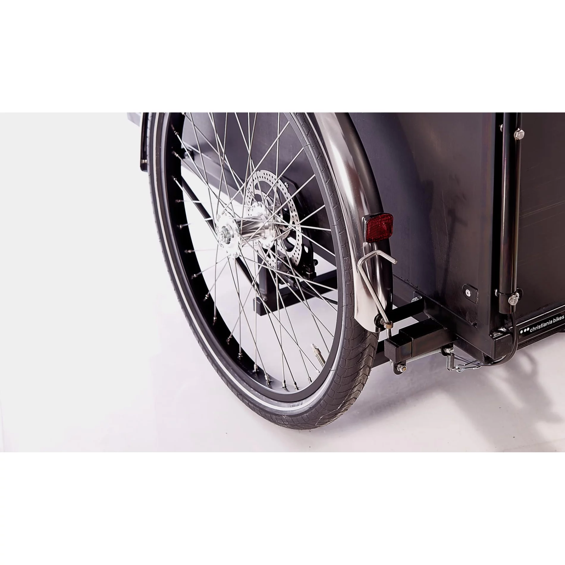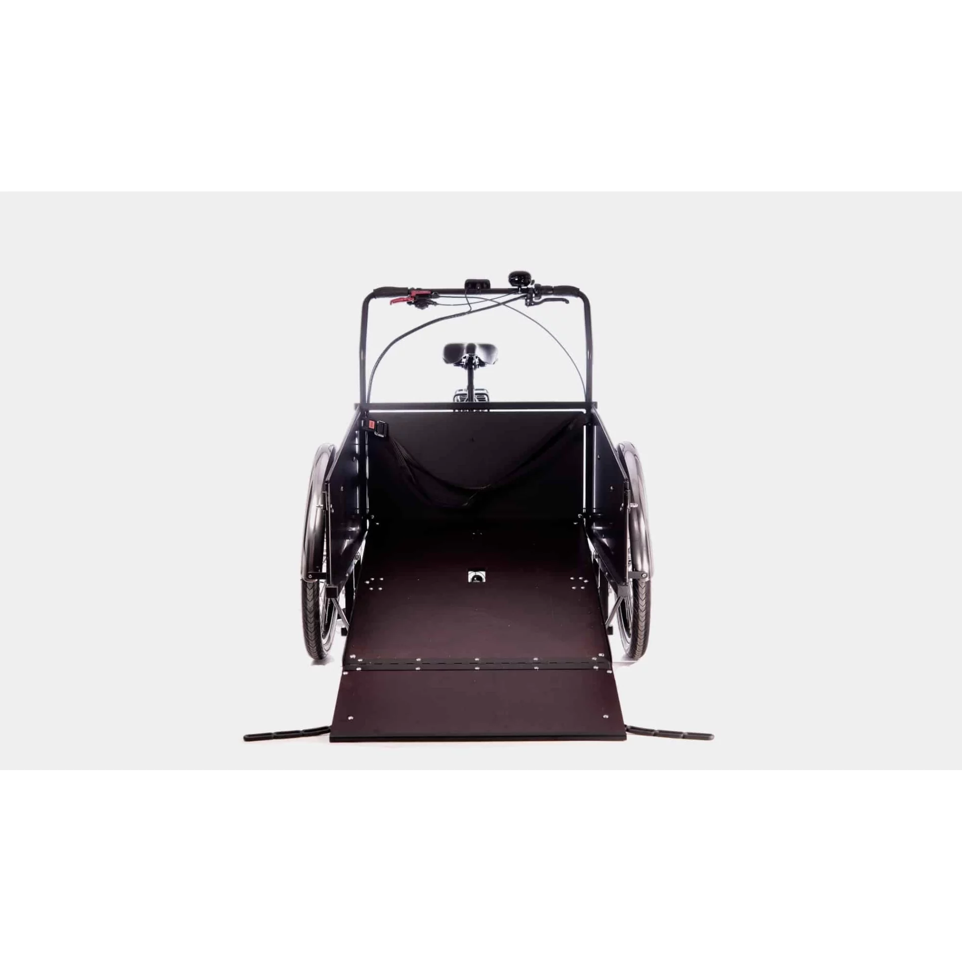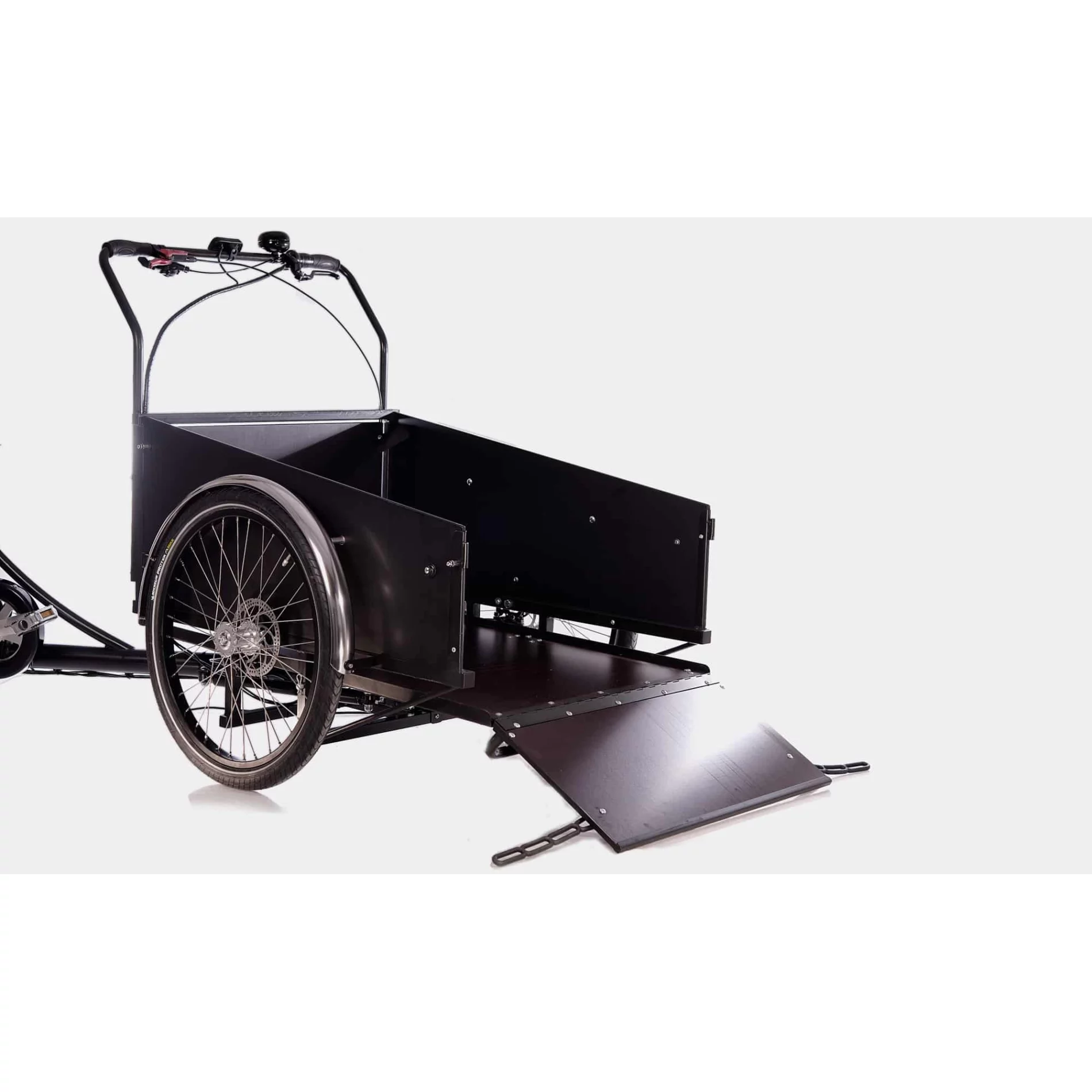 The Christiania Model S was developed in 1994 and has been designed for the transport of wheelchair users, specifically children with special needs. By using the special hook mounted on the left side of the box, the platform can easily be converted into a ramp, where the wheelchair can be pushed up/down. The wheelchair can be secured with a strong safety belt. Standard specification includes an 8 speed rear internal hub, rear roller brake and front Hydraulic Disc's. There is also the option to add a rear hub drive motor (which will also have a rear Derailleur in place of the internal hub gears) , or the Pendix mid drive system. NOTE THE MODEL S PICTURED HAS THE OPTIONAL REAR HUB MOTOR OPTION - It can be supplied with pedal power only or with a Pendix Mid Drive motor. Contact us to discuss.