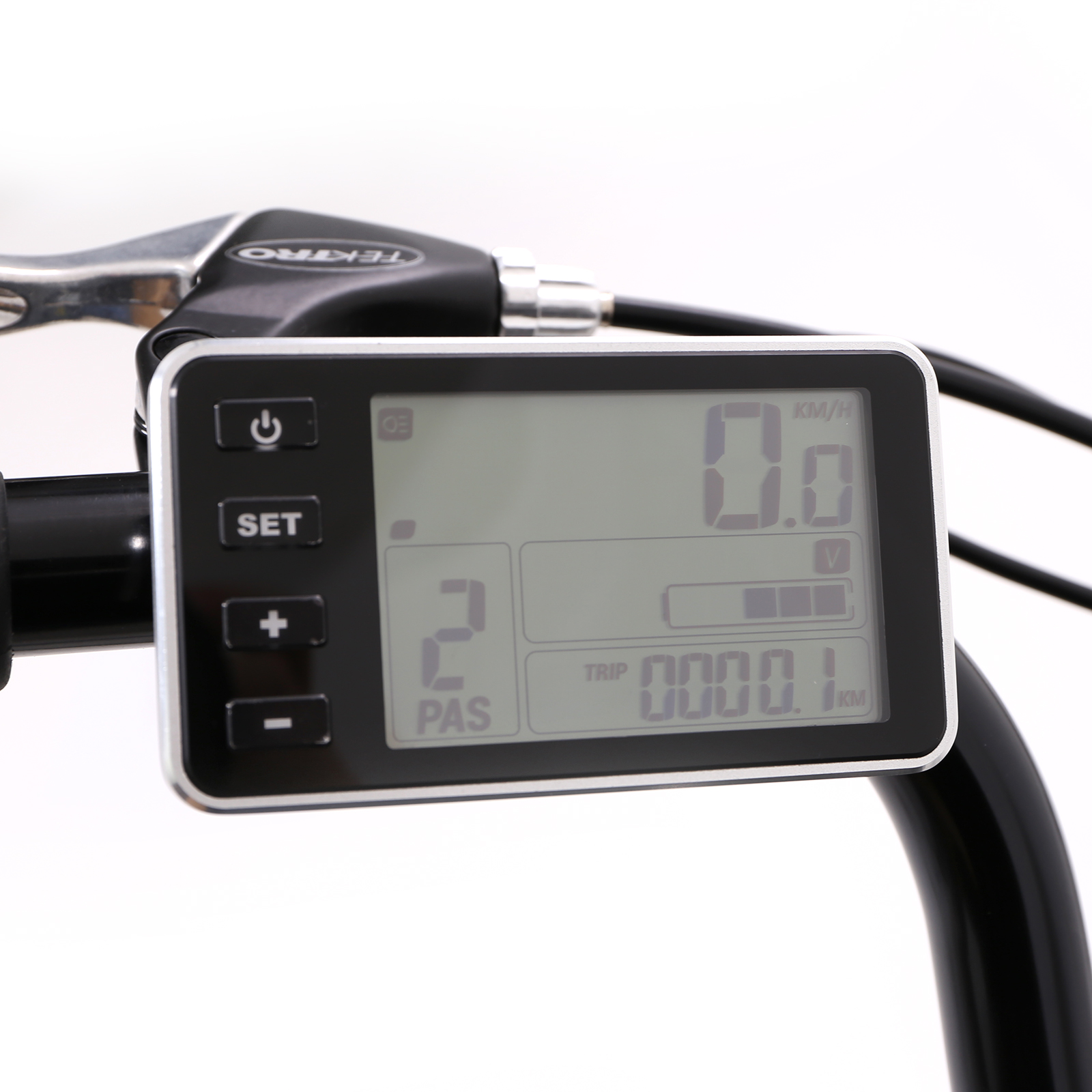 - Display: Backlit LCD with USB Charging port, 7 levels of assist (0 no assist and 6 PAS levels), power meter, battery charge indicator, and trip functions.