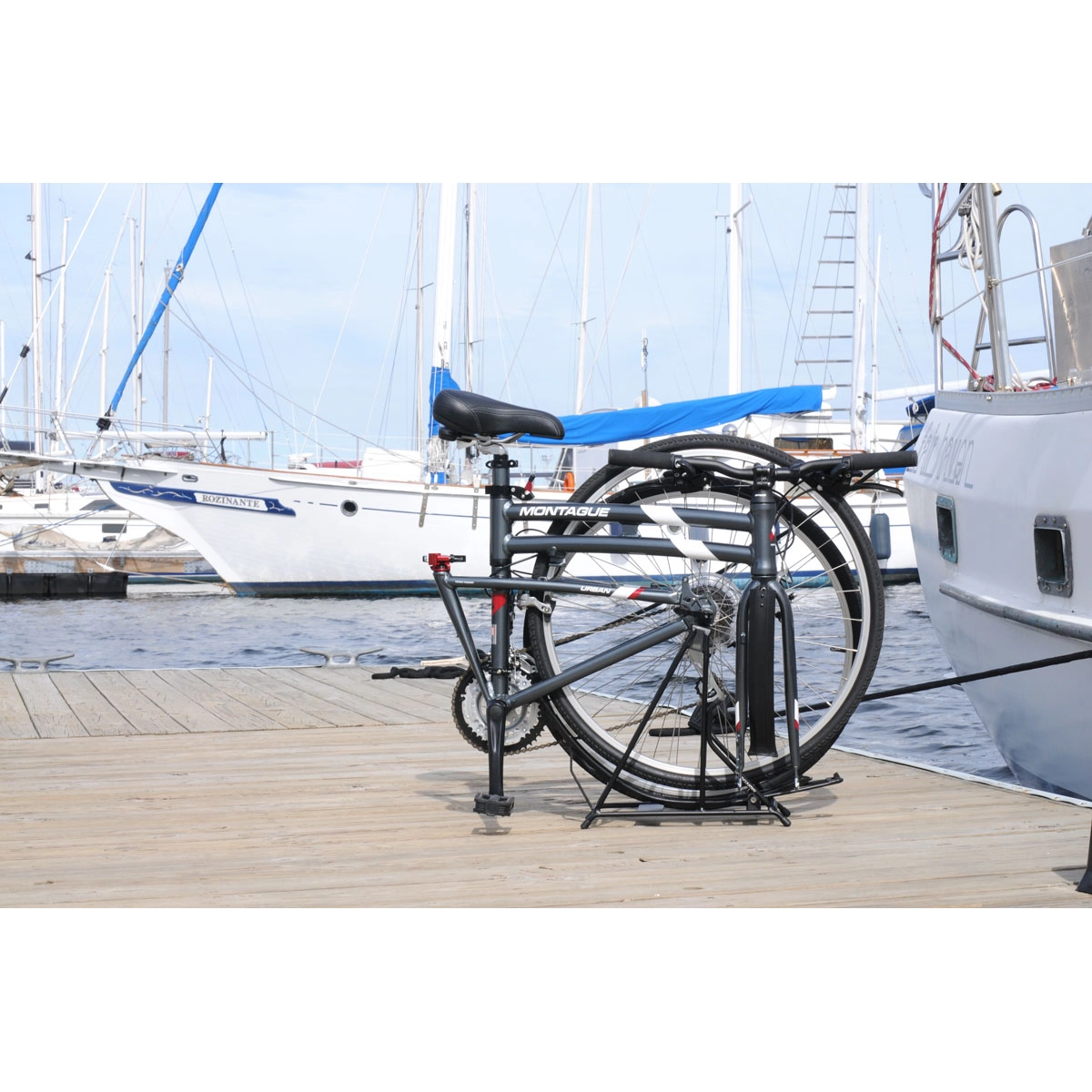 The patented RackStand offers cargo carrying capacity and has a built-in fender, acts as a kickstand, and serves as a stand for the folded bike.