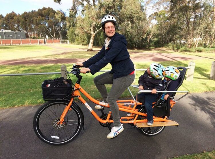 Nina Schwab and her partner René, rode their bikes everywhere before they had kids and now take their two kids aged nine months and four to childcare on the back of a Yuba cargo bike on the way to work every day at Melbourne Uni. “My kids love sitting up behind me while I’m riding and watching the world go by – and a cargo bike becomes a real talking point at the childcare gates,” said Nina. “I can see huge potential for cargo bikes in Melbourne, especially with young families. We use the bike all the time; for shopping trips, going to farmers markets and playgrounds and the beach on weekends. It’s easy to park and as a family, we like the feel-good factor of cycling – feeling healthier and fitter, enjoying the freedom a bike gives us and knowing we’re not polluting the environment.”