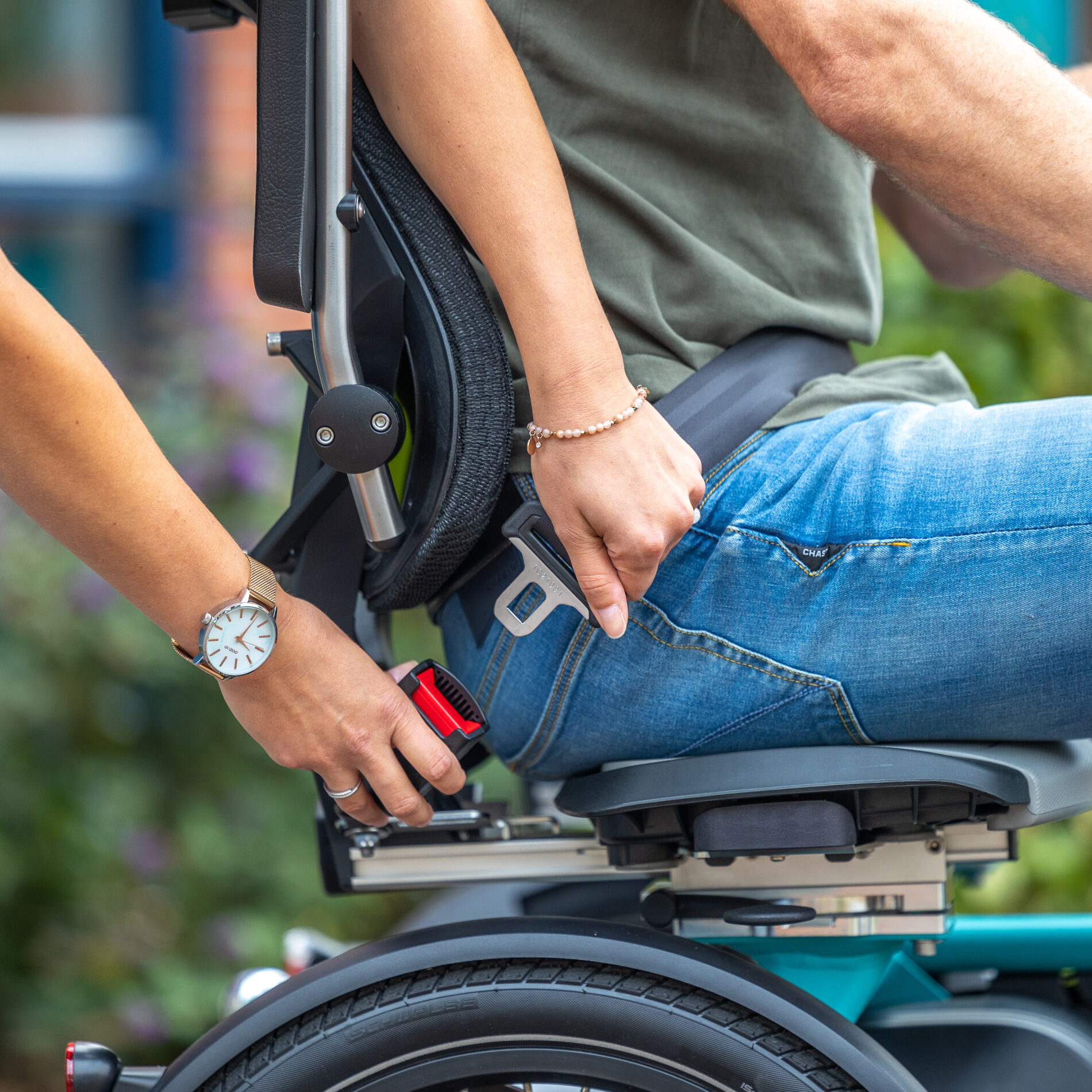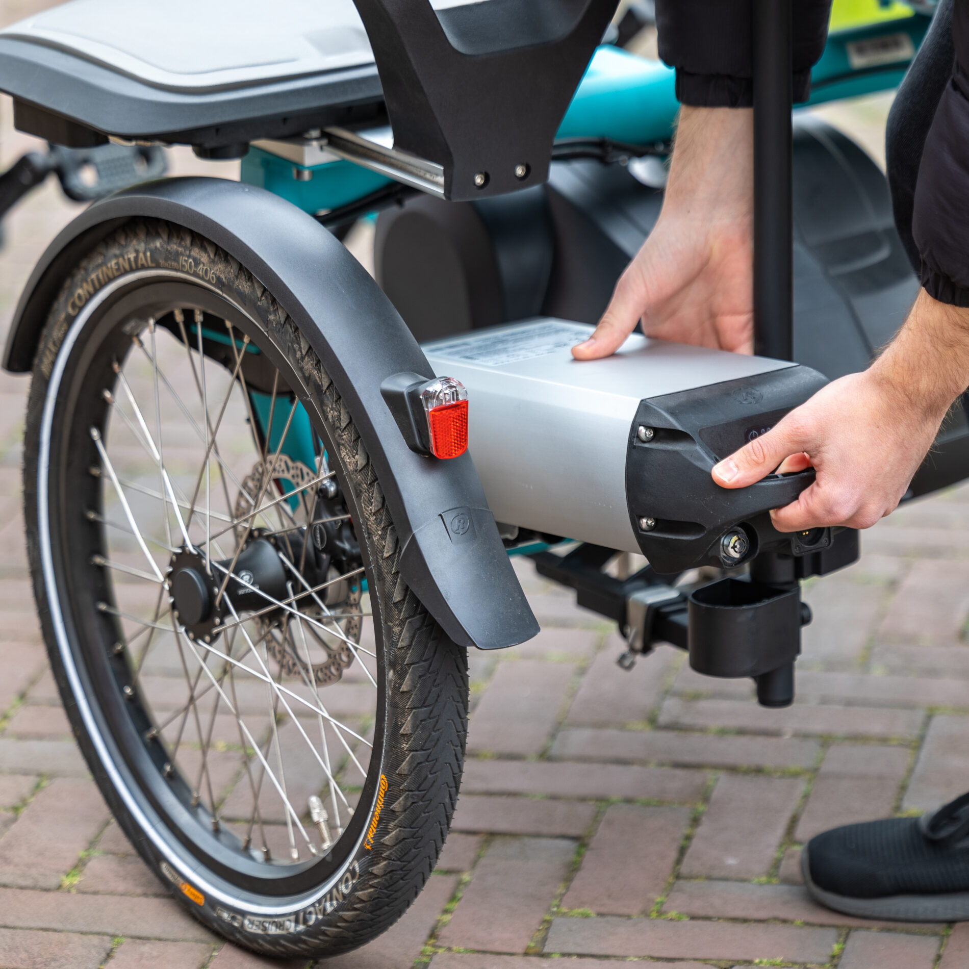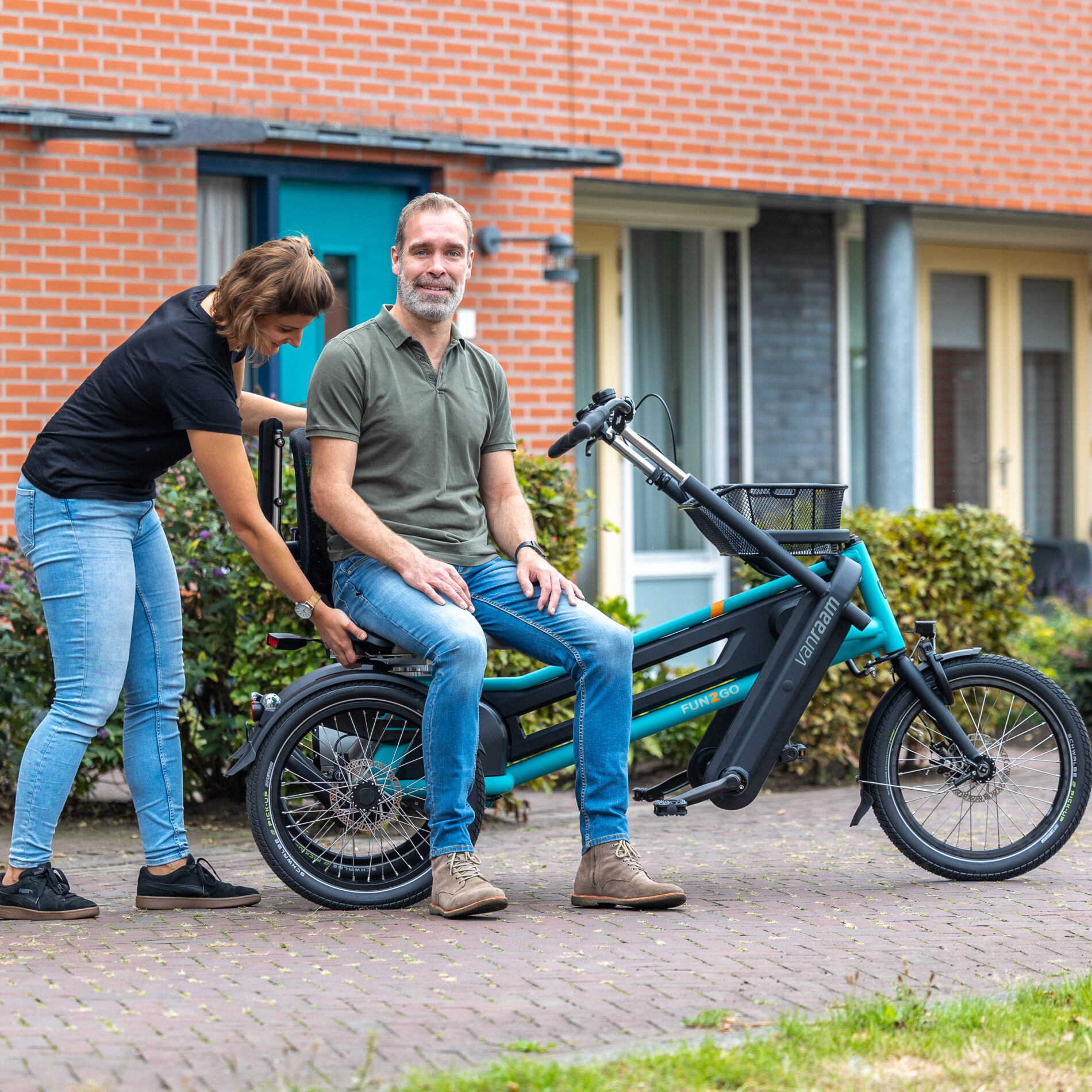 The vanRaam Fun2Go is optionally available with a reinforced frame. A single seat of the Fun2Go is suitable for individuals weighing up to 180 kg. When two people are seated on the Fun2Go, the bike can carry a total weight of up to 280 kg (distributed across the 2 seats).