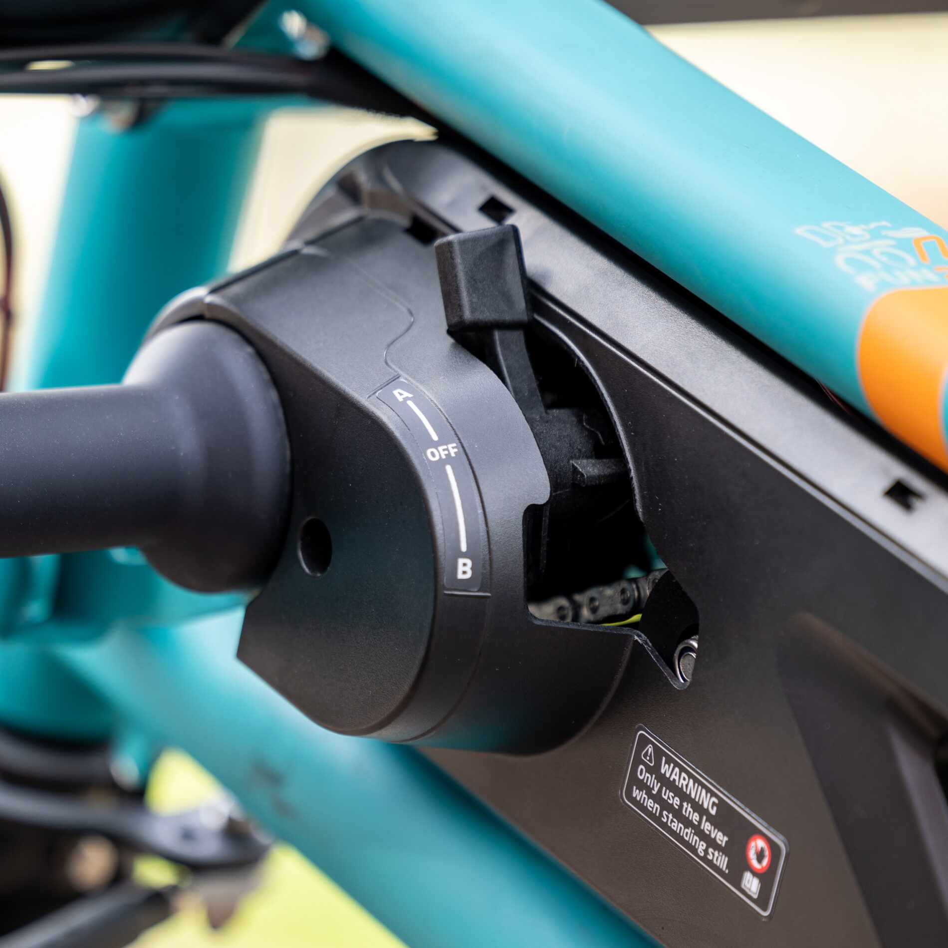 On the Fun2Go, the driver and passenger cycle in the same gear with a shared 8-speed hub. It is optionally possible to choose a double 8-speed hub, allowing the driver and passenger to choose their own gear independently.