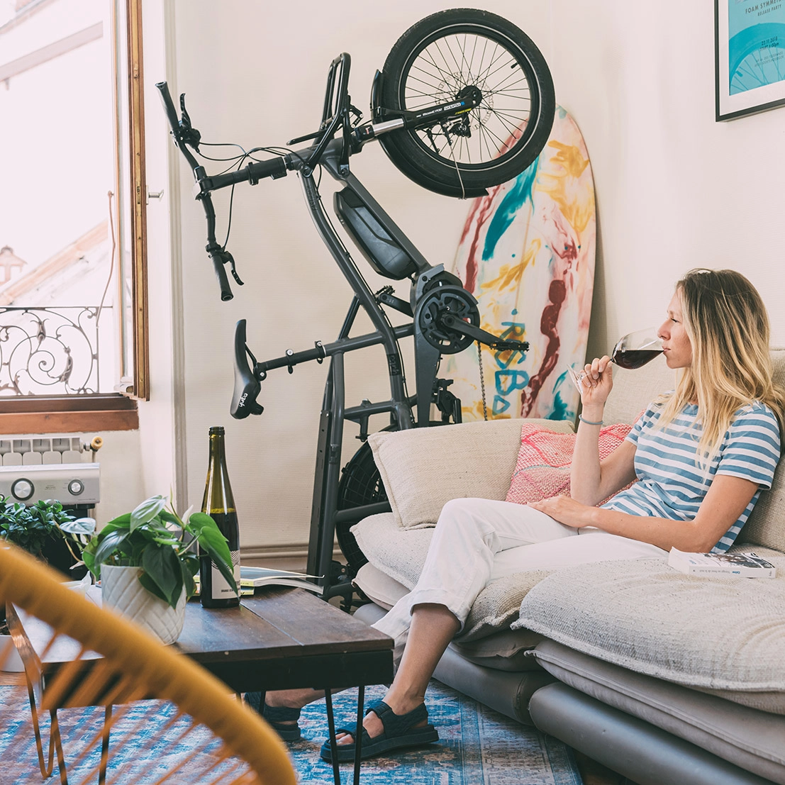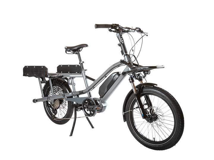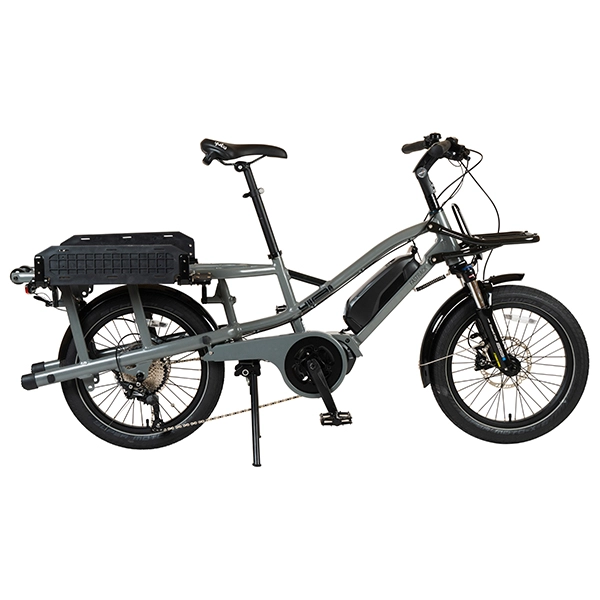 Pre-order this todayThe Yuba Fastrack is a compact mid-tail cargo bike that carries up to 200 kg and easily manoeuvres in tight spaces. It can also be stored vertically.